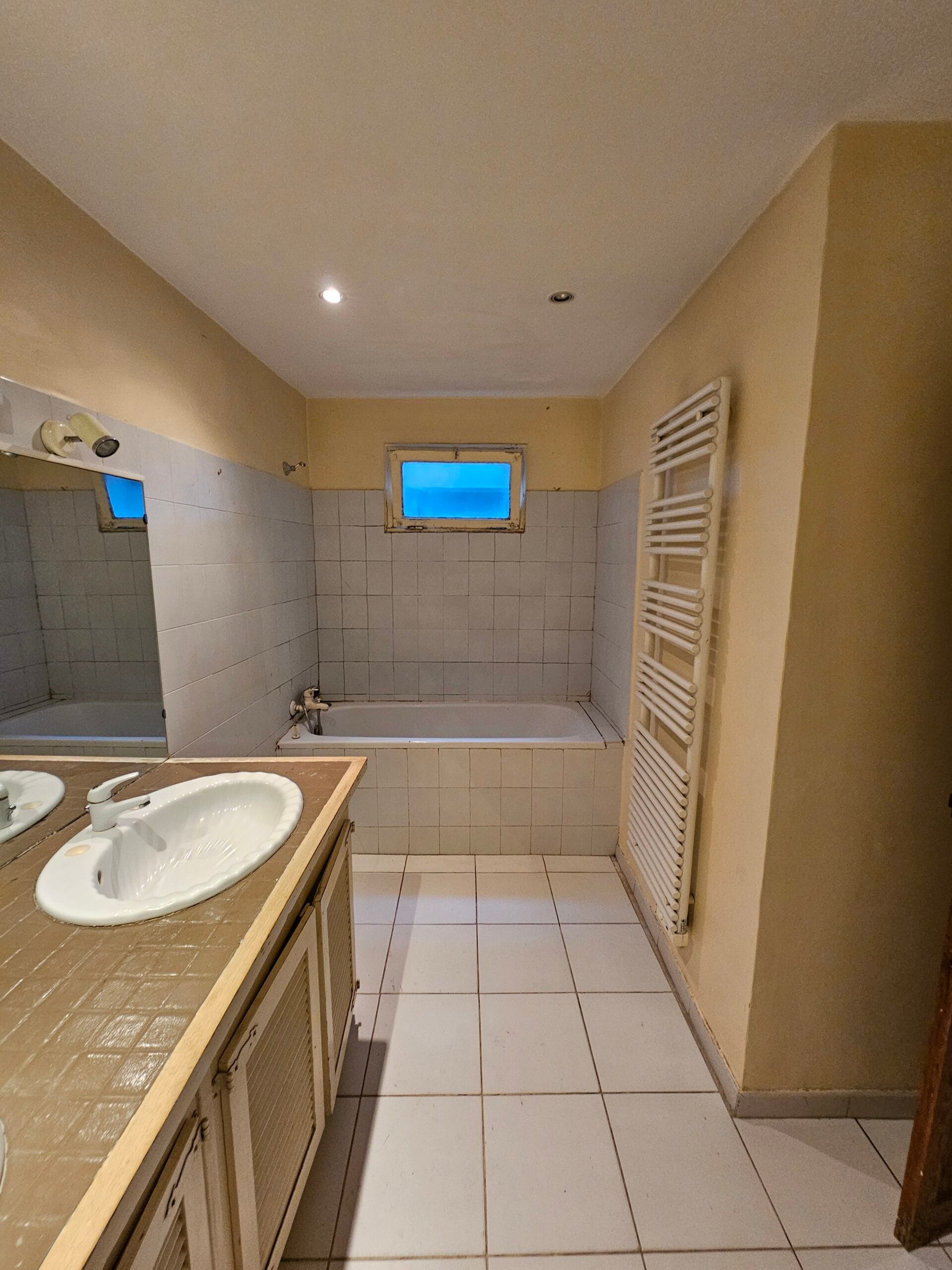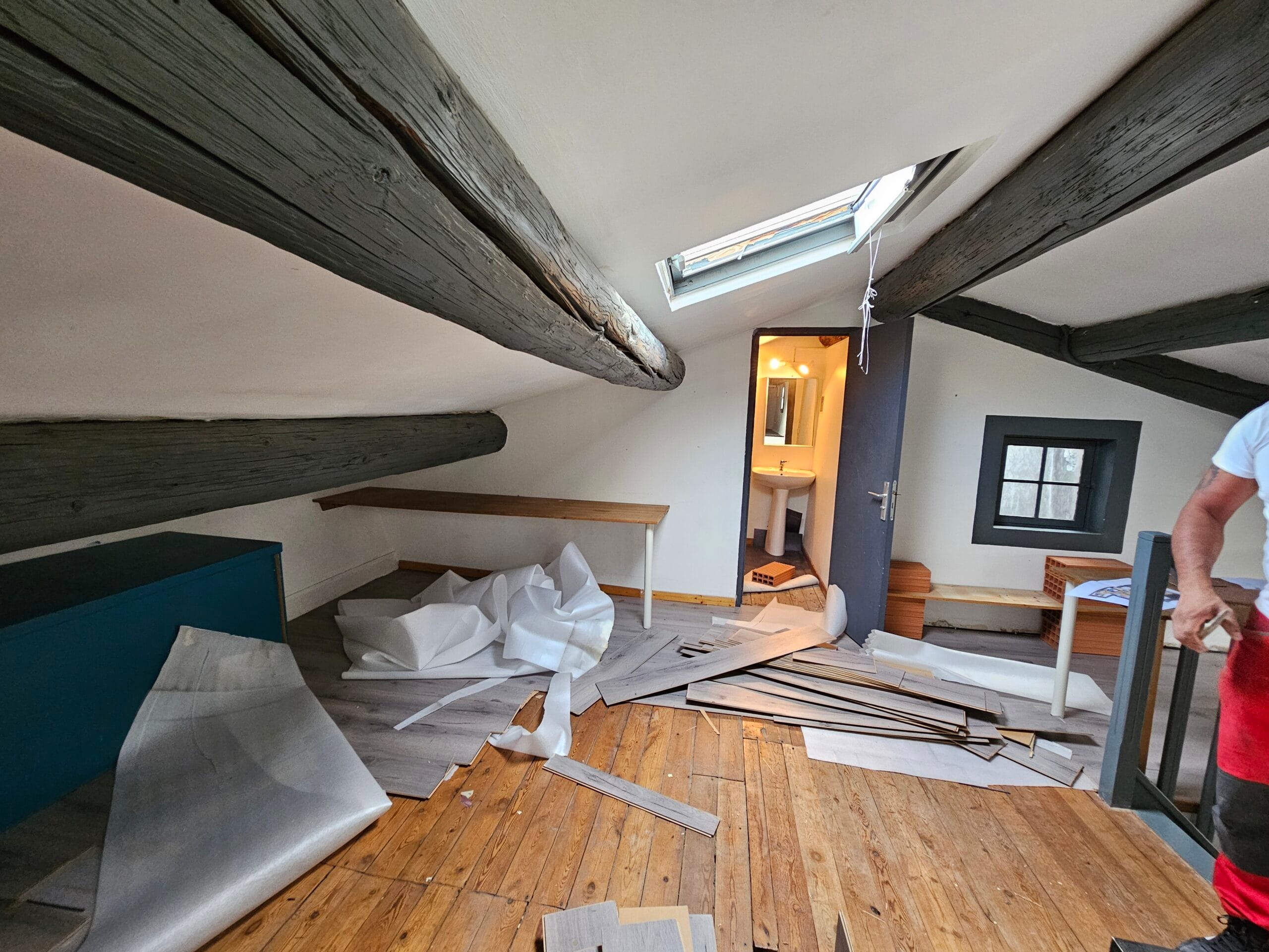 Au rez-de-chaussée, ils ont déposé les sanitaires (baignoire, meuble vasque), le carrelage au sol et aux murs de la salle de bain, l’ensemble des parquets, et toutes les portes intérieures.