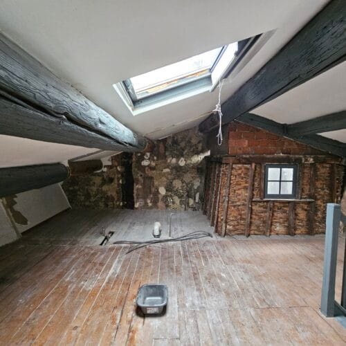 Les 2 Velux de la mezzanine présentent des fuites. Leur remplacement est planifié en début de chantier, avec ajout de volets roulants pour améliorer l’isolation thermique et phonique.