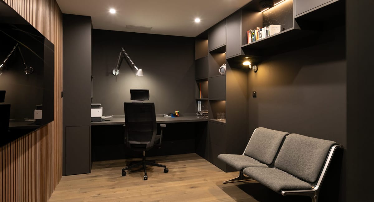 - Pour un effet tout-en-un, les murs, le bureau et les rangements sont peints dans le même gris anthracite. Les interrupteurs et les prises sont également assortis.