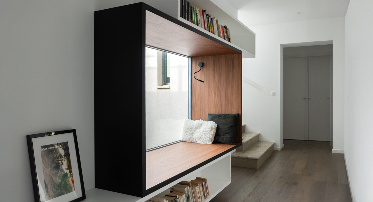 - Autour de la baie fixe, création d’une grande niche faisant office de banquette, avec lampe et prise USB intégrée. L’intérieur est revêtu de noyer et l’extérieur est laqué noir.