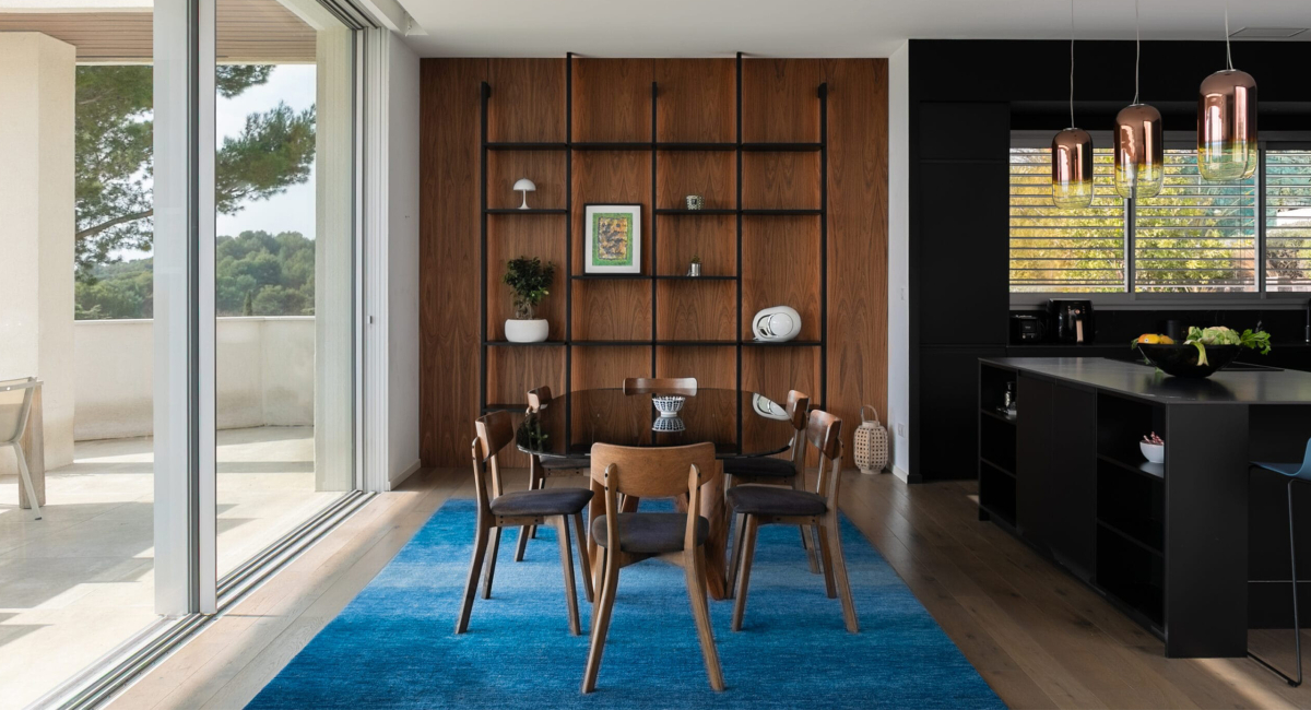 - Sous la table, le tapis bleu rappelle les tabourets de la cuisine attenante et les coussins des transats dans le jardin.