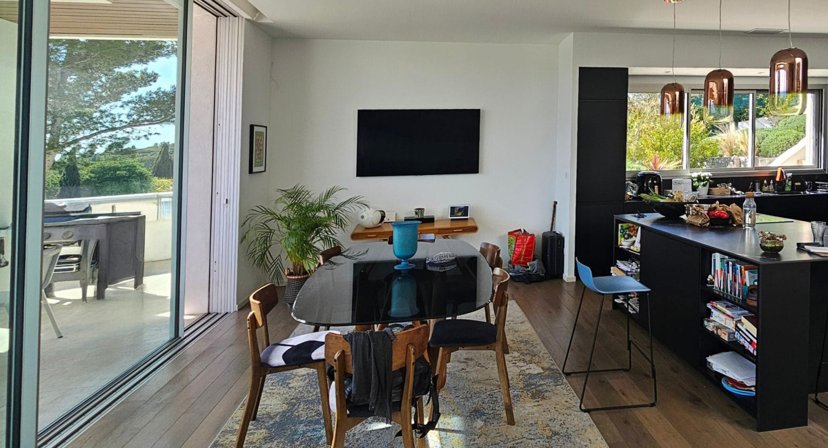 - La cuisine s’articule autour d’un ilot noir. Le mur de la fenêtre a été peint dans le même ton pour harmoniser l’ensemble.