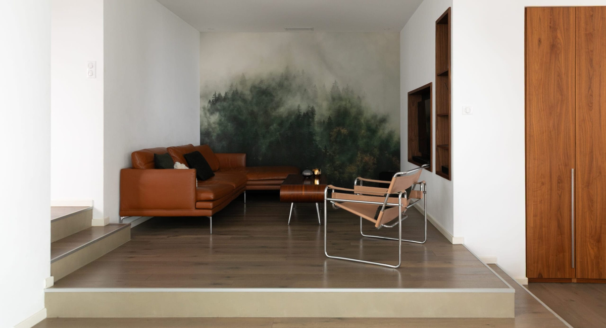 - Pose d’un papier peint illustrant une forêt dans la brume pour une ambiance intimiste.