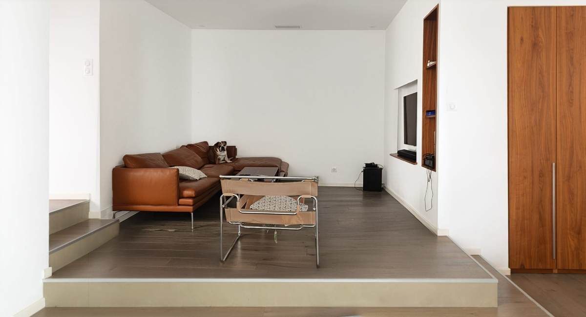 - Reprise des contre-marches de l’estrade dans une tonalité de béton ciré qui s’harmonise avec le parquet massif.