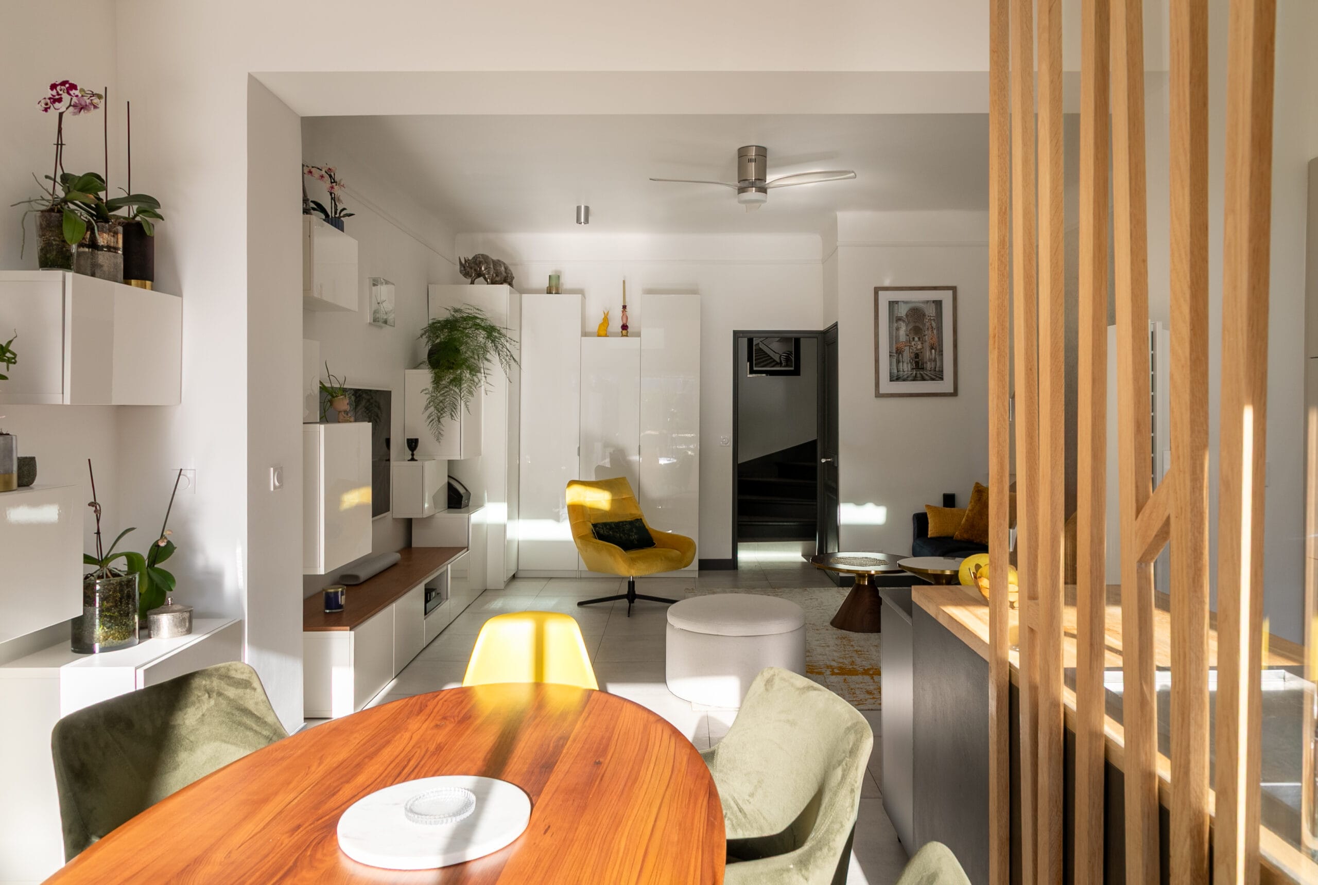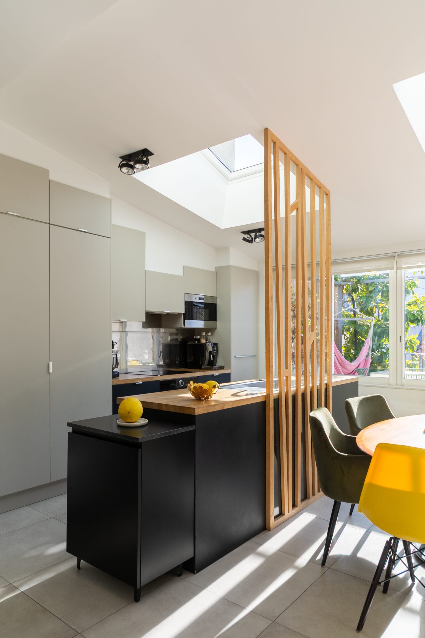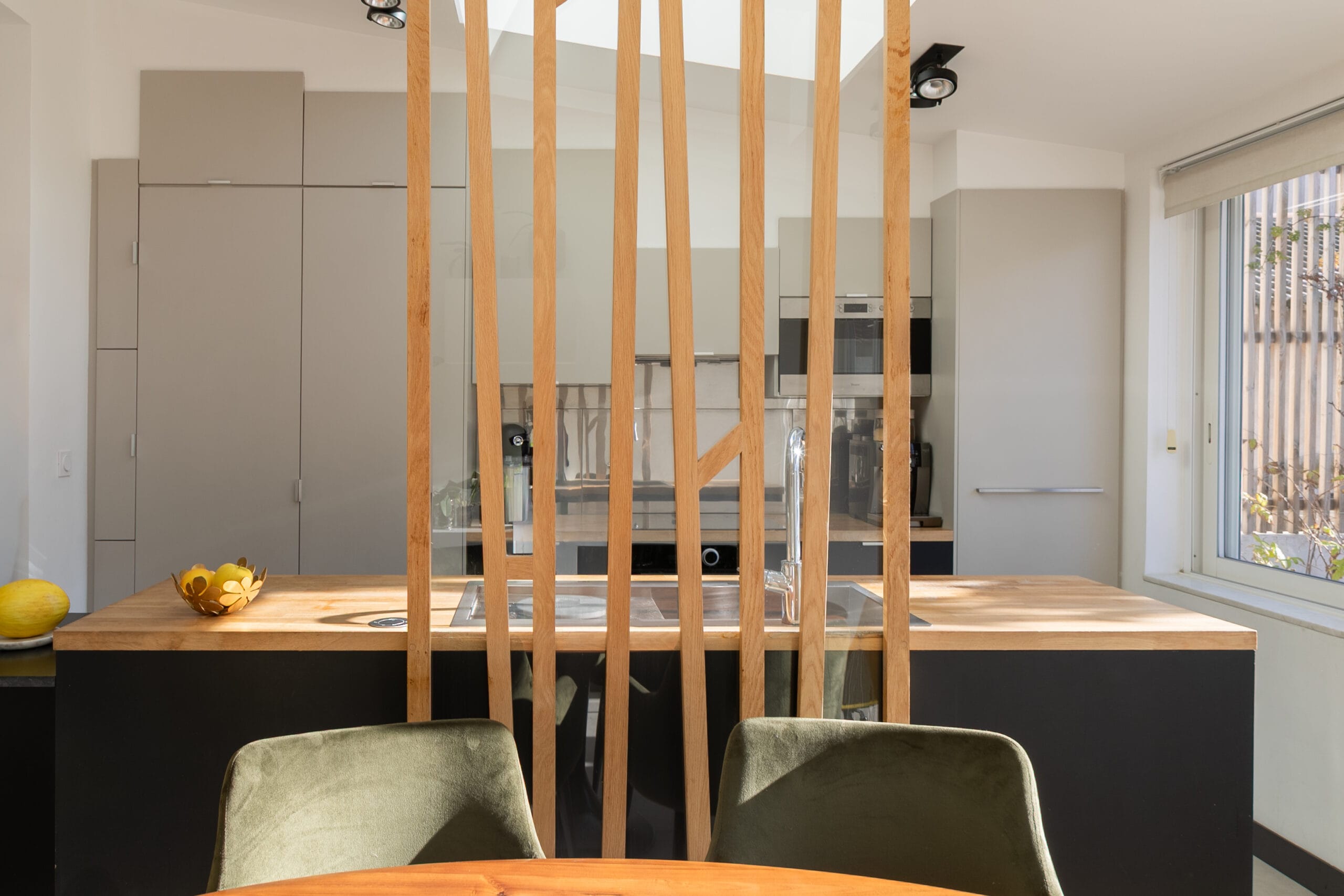 • Création d’un claustra sur mesure en bois et en verre pour séparer la cuisine et la salle à manger.