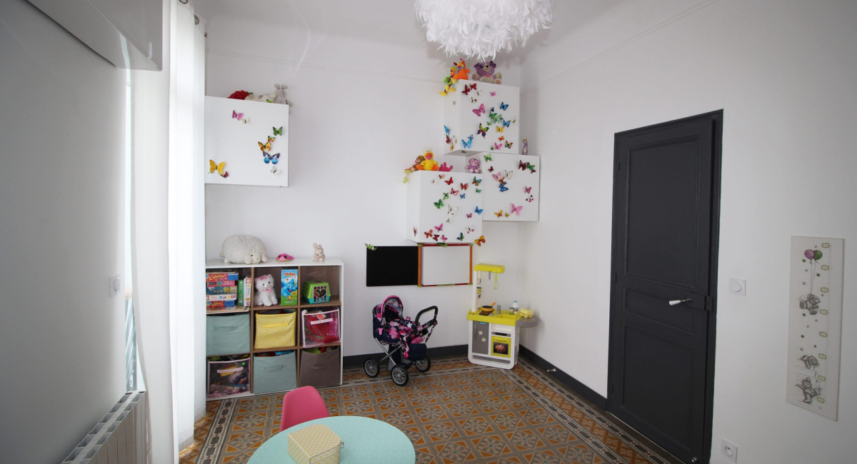 Cette maison de village de 125 m² avait besoin d'une rénovation et d'un réagencement total. L'objectif était de moderniser la maison, d’effectuer une rénovation énergétique et de créer une suite parentale au rez-de-chaussée. Les avantages de la maison : une belle hauteur sous plafond, une double exposition, des carreaux ciments très bien conservés dans les chambres. Les contraintes : beaucoup de travaux de mise aux normes : gaz, électricité, conduit de cheminée…