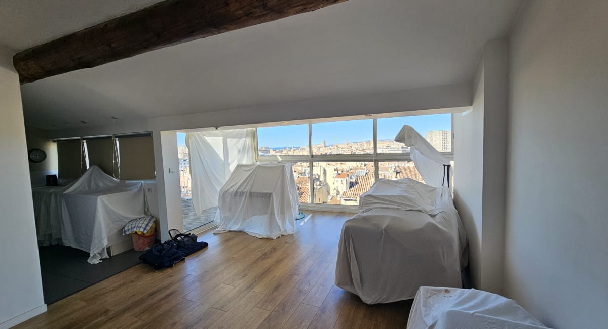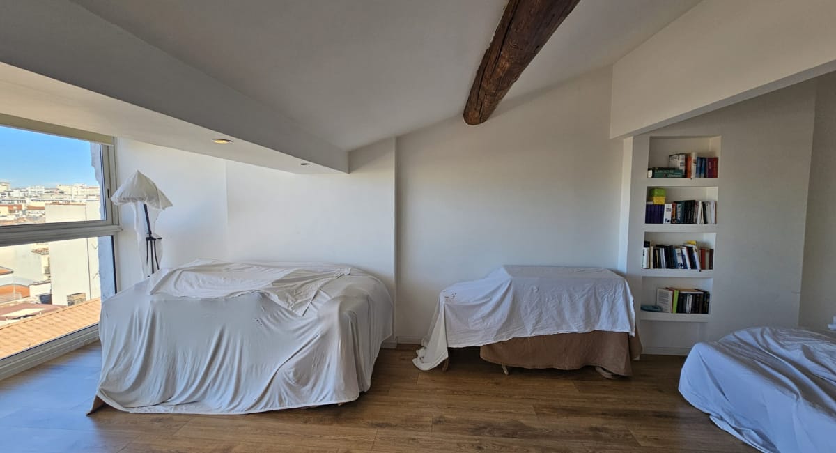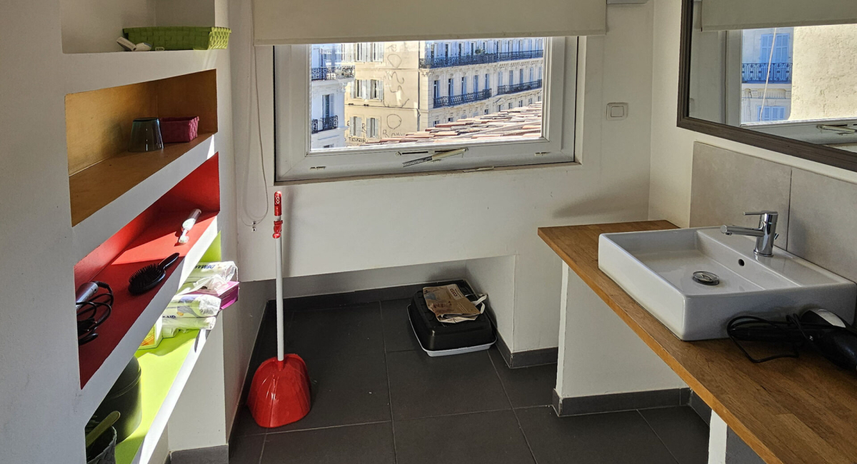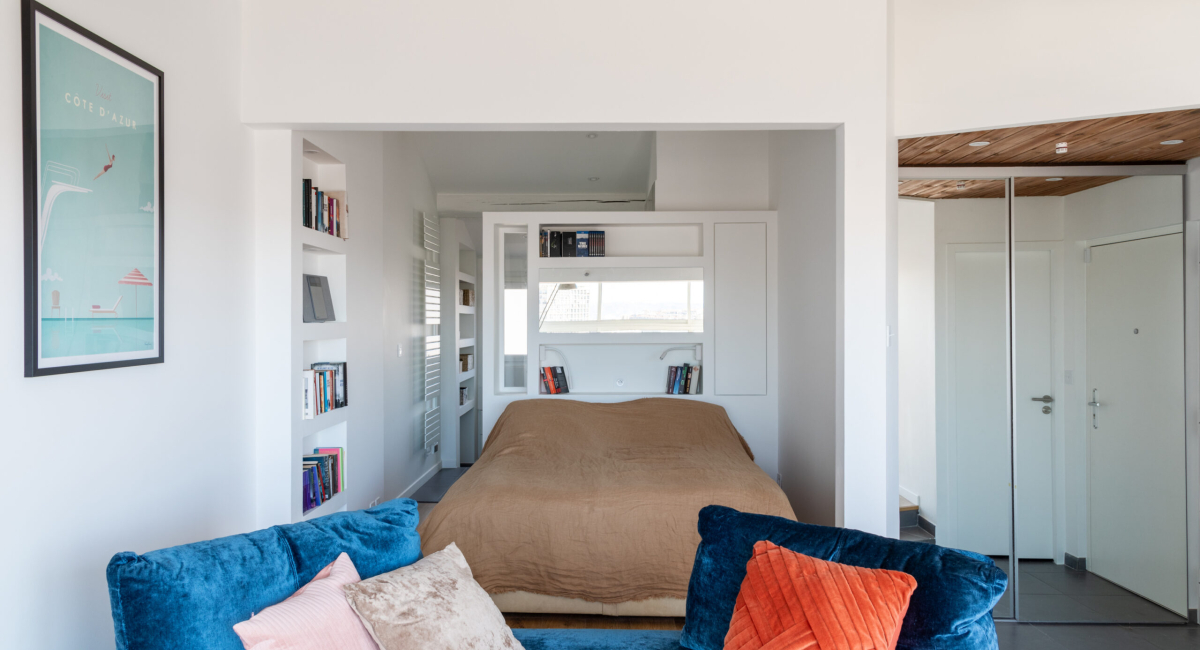 Cet appartement d’environ 40m2, situé sous les toits dans un immeuble haussmannien, avait précédemment été rénové dans un esprit loft. L’objectif était ici de le réaménager pour le rendre plus qualitatif et plus fonctionnel. L’atout principal de l’appartement est sa vue panoramique sur la ville et la mer. L’enjeu de ce projet était donc de proposer des solutions pratiques, notamment des rangements, tout en préservant la luminosité et la vue.
