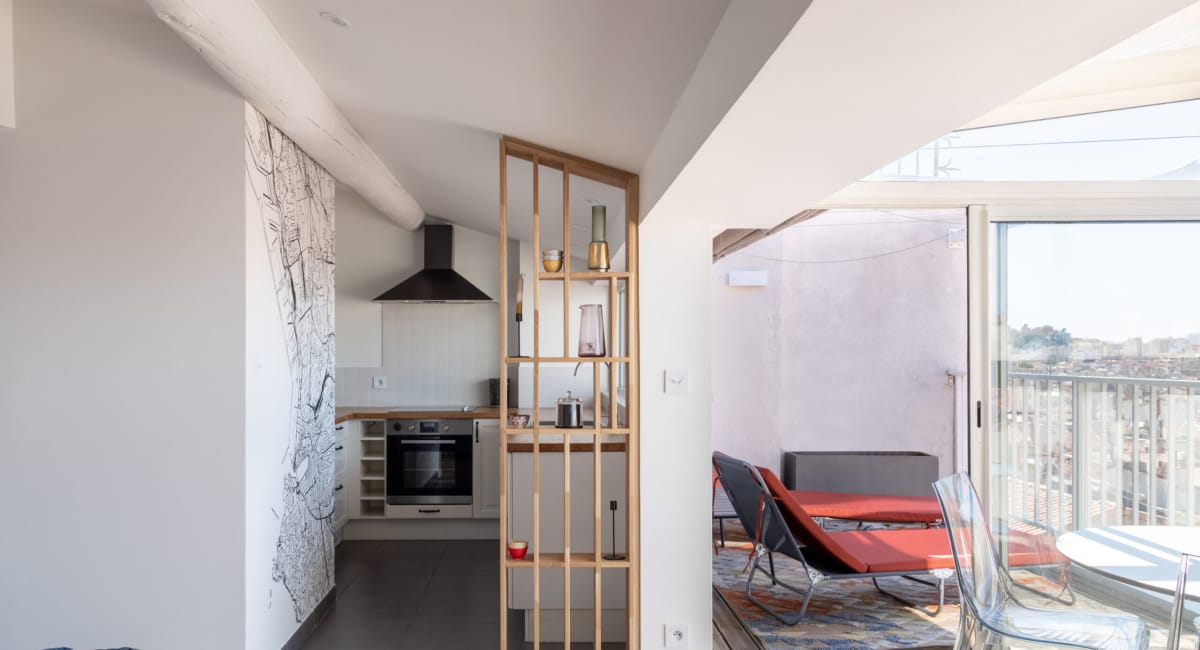 • Créer un claustra en bois sur mesure pour séparer la cuisine et le salon tout en gardant l’esprit loft, pour un aspect plus fini et plus esthétique.