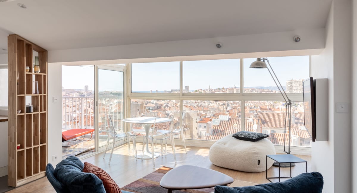 • Dans la cuisine, nous avons posé un plan de Marseille en papier peint panoramique, en clin d’œil à nos clients originaires de Suisse, qui ont eu un véritable coup de cœur pour la ville.