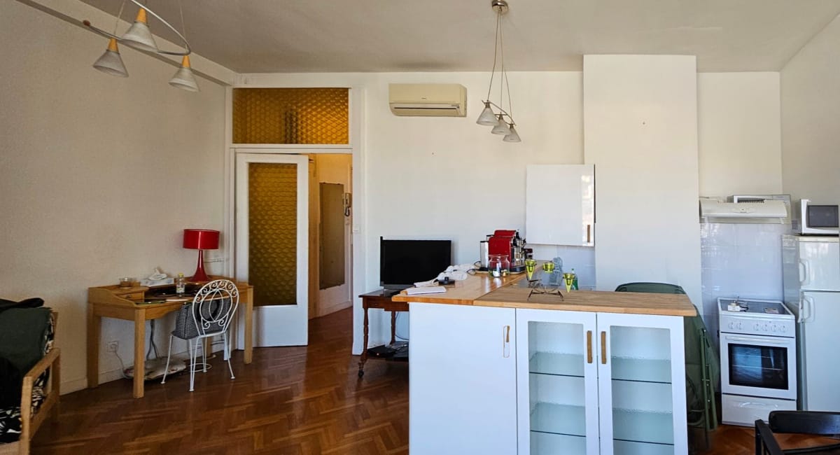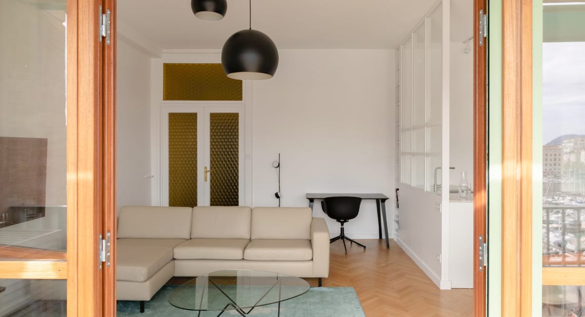 Situé dans un immeuble emblématique conçu par Fernand Pouillon et classé au titre des Monuments historiques, cet appartement de 55 m² constitue la résidence secondaire d’un client vivant en Angleterre. Attaché à l’emplacement exceptionnel du bien, il souhaitait un intérieur lumineux, apaisant et surtout une véritable sensation d’espace, malgré la surface réduite et les contraintes liées au classement du bâtiment.