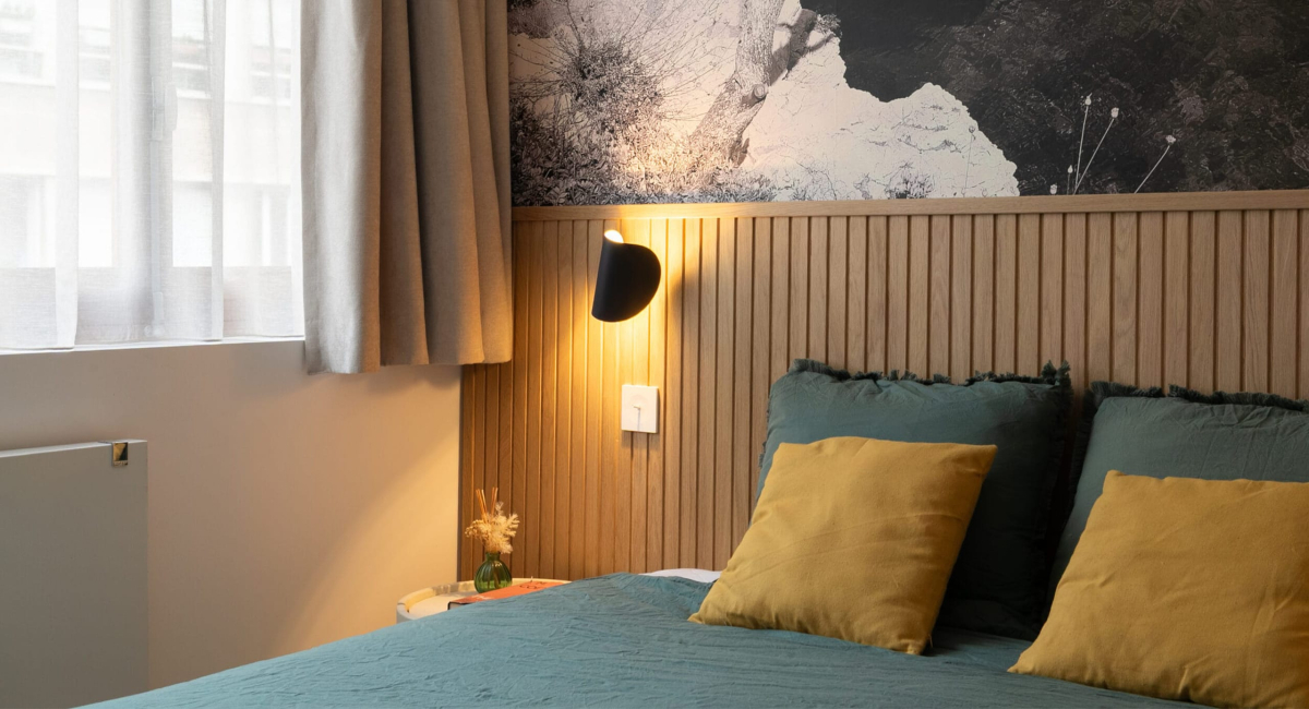 • En guise de papier peint : une photographie des calanques prise par le client, agrandie et imprimée sur mesure.