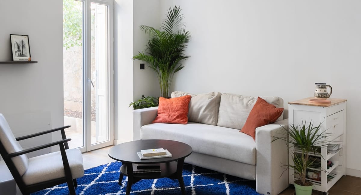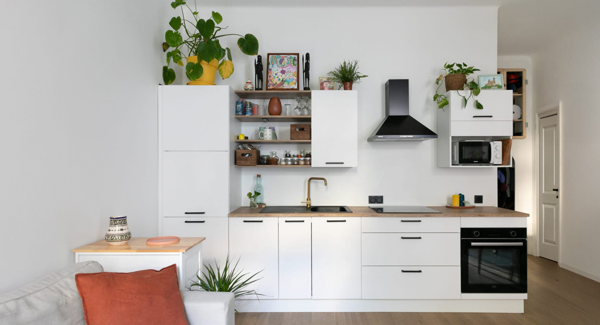 - Dans la pièce de vie, les murs peints en blanc permettent de compenser le manque de luminosité.
